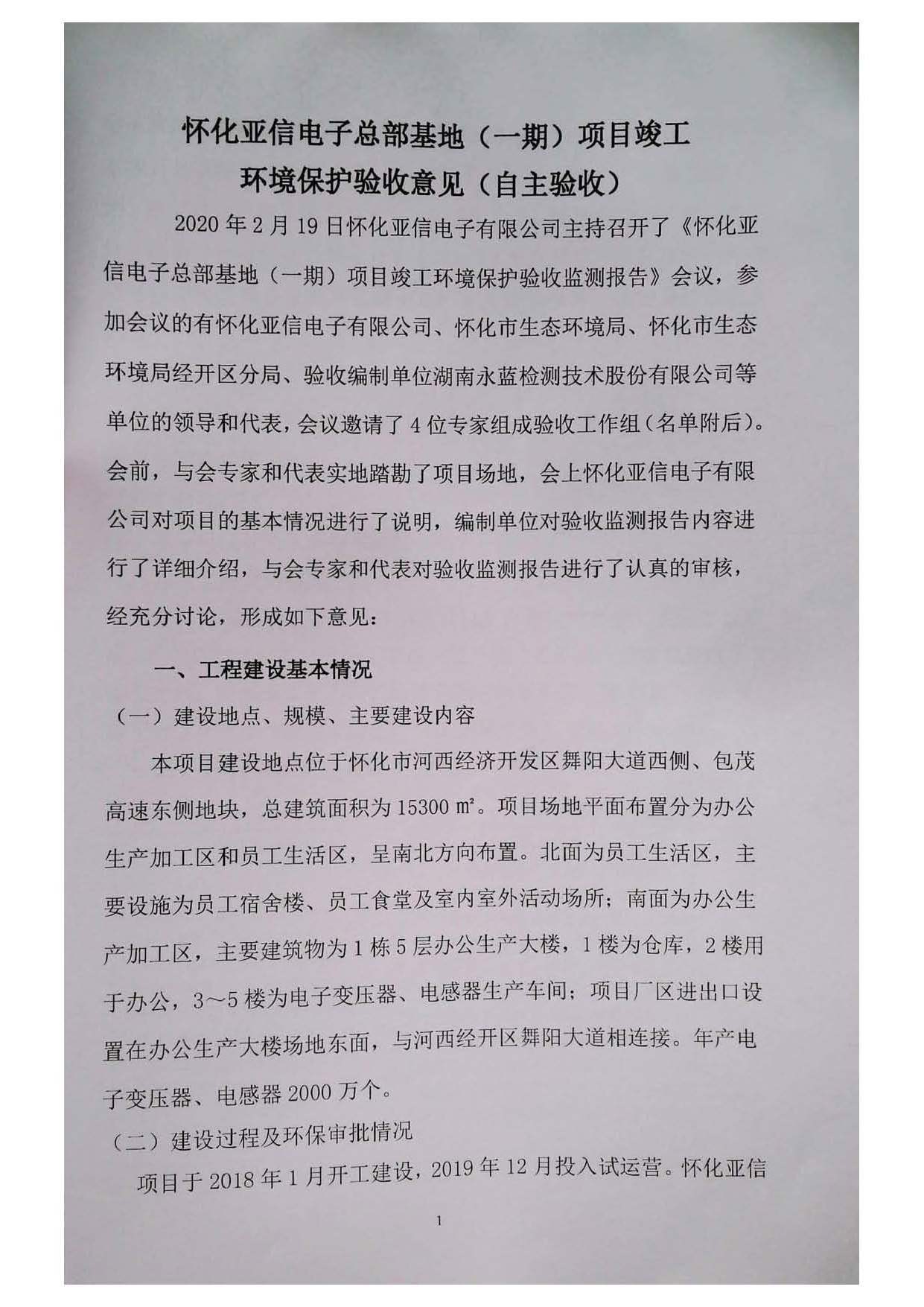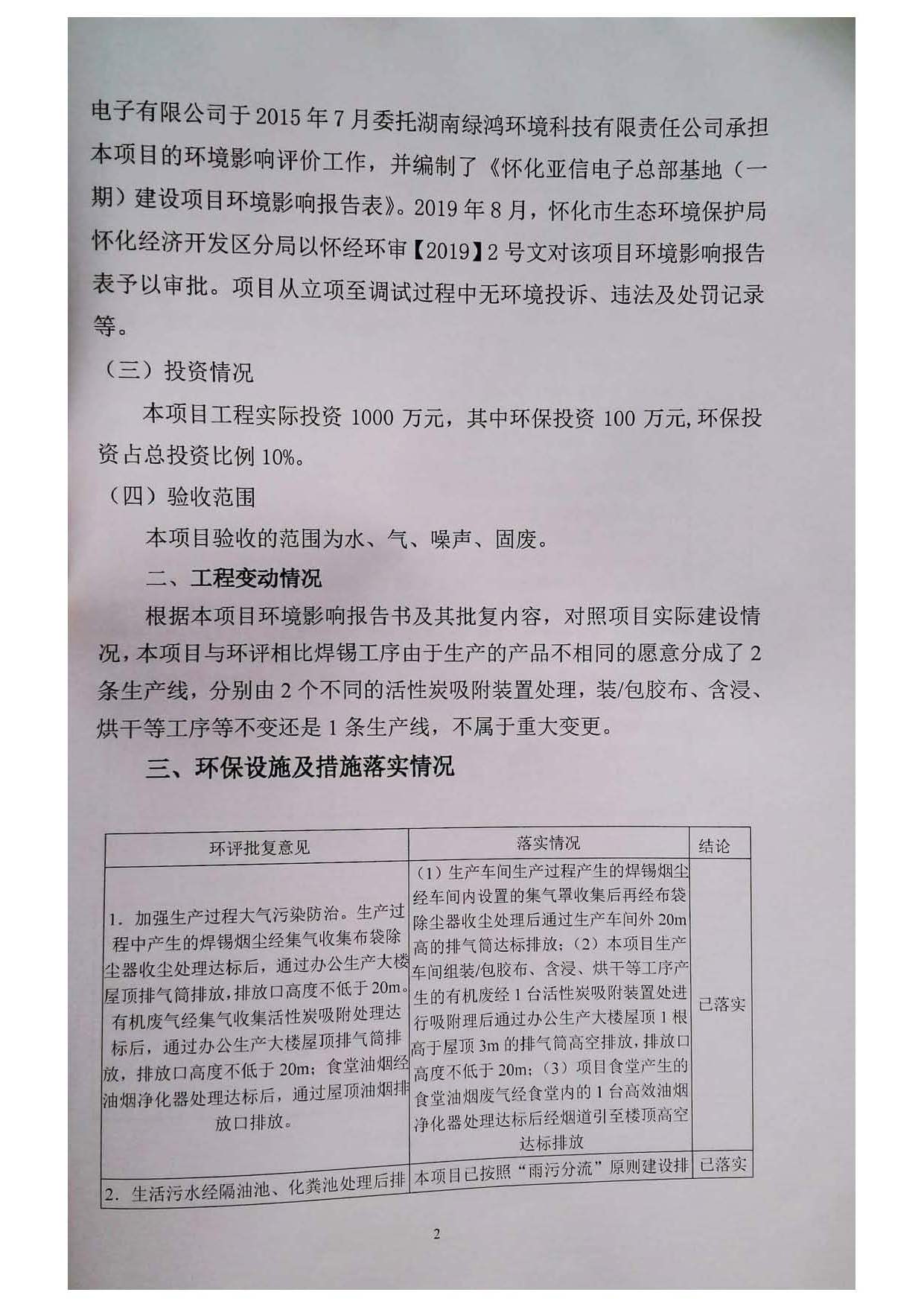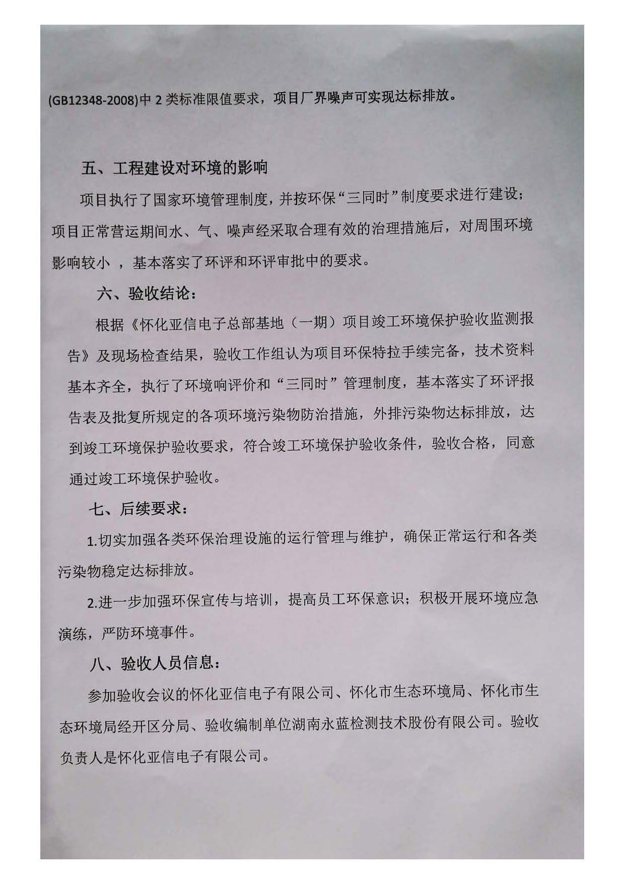 怀化亚信电子有限公司环境保护验收结果公告